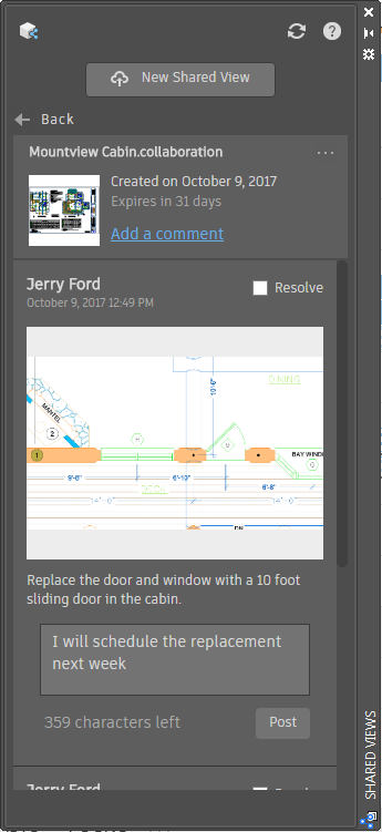 You can expand any view in the Shared Views palette to read or post comments and reply to comments received from others with whom you have shared views.